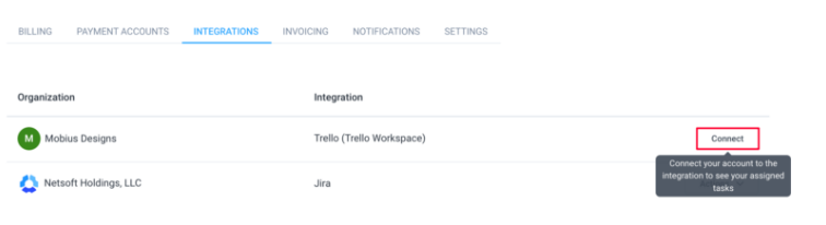 IMPORTANT: You must connect your account in order to see tasks that are assigned to you. Also, connecting an integration allows for time to be sent back to the third-party software.