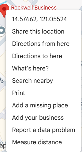 b. Right-click on the pinned location, which is marked by the red pin, and click What's here?. This will generate the coordinates of your selected location at the bottom of the screen.