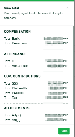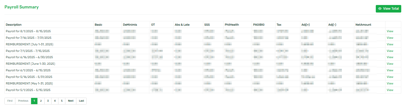 To streamline the process of viewing total amounts for each column, we have implemented a "View Total" feature. By clicking on "View Total," users can quickly access the totals for their compensation, attendance, government contributions, adjustments, and net amount. This enhancement simplifies the user experience, making it easier to review and analyze payroll data.