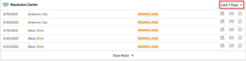 The Resolution Center widget on the dashboard displays resolution items for an employee based on the Attendance Report. To minimize loading latency, the widget processes items within a specific date range. The default filter shows items from the last 7 days, with additional options for 3 days, 14 days, and the current month. Initially, the widget displays the first 5 reminders. Users can click "View More" at the bottom of the widget to load additional resolution items according to their preferred filters on the Resolution Center. This feature provides users with a tailored and efficient way to manage and address resolution items, improving overall productivity and decision-making.