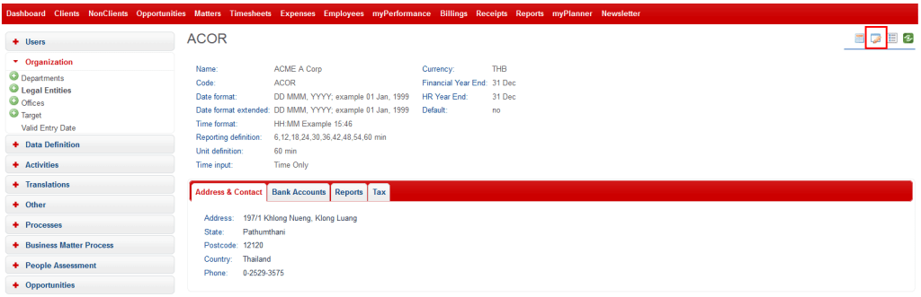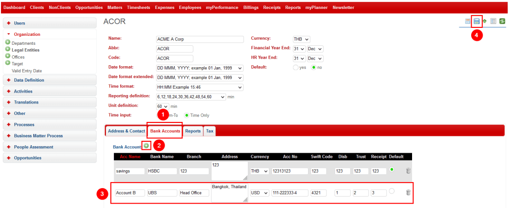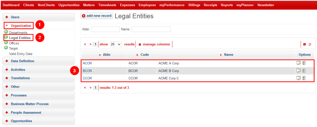 2. Click on the ‘Organization’ menu, then select ‘Legal Entities.’ Choose the desired legal entity to add a new bank account.