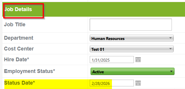 3. Under Job Details, go to the Status Date, select the date, and Save