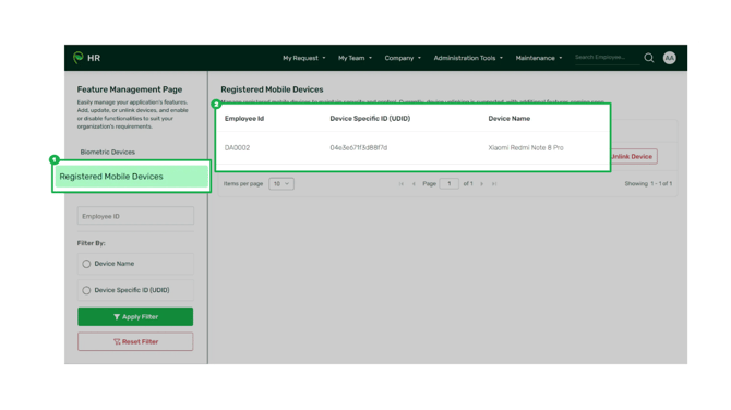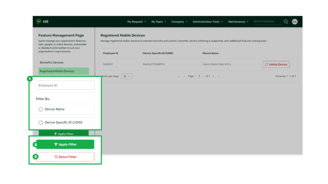 - Use the filter options to search by: Employee ID, Device Name, Device Specific ID (UDID)