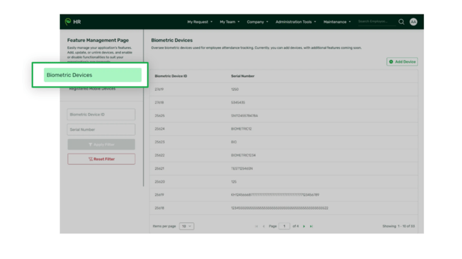 - Go to the sidebar Navigation on the left of the page and select Biometric Devices.