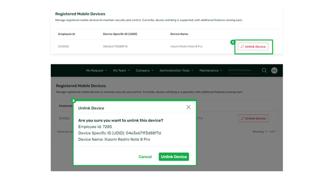 Employees can easily unlink their own mobile devices through the mobile app, but admins also have the option to handle it on their behalf when necessary.