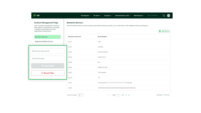 - A list of all biometric devices registered under your account will be displayed, with their Biometric Device ID (System-Generated) and Serial Number.