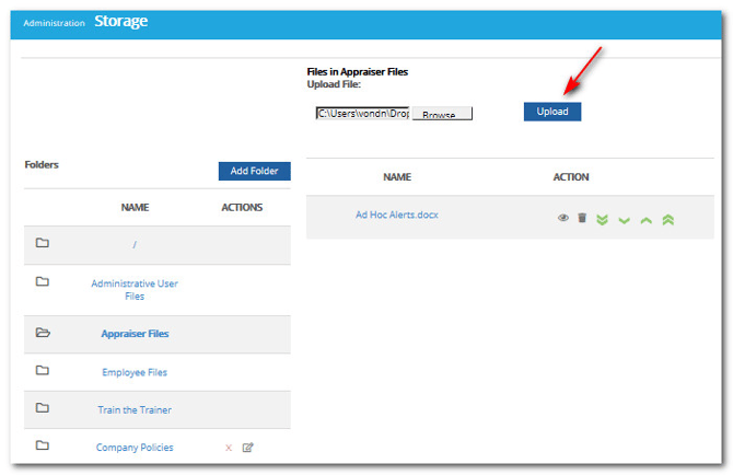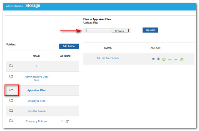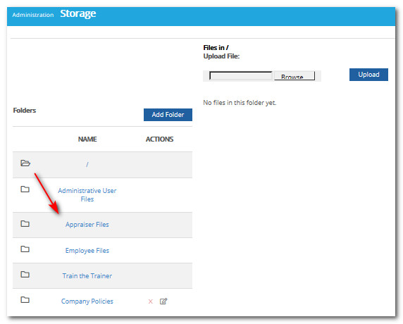 Note: Users in the Appraiser role will be able to see documents placed in the Appraiser Files and Employee Files folders. Users in the Employee role will only be able to see documents in the Employee Files folder.