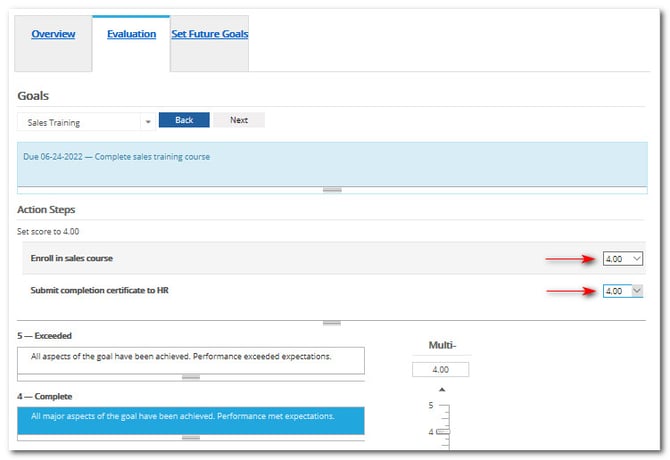 If the Goal has Action Steps with rating boxes, rate each Action Step. Ratings on Action Steps will be averaged together to produce a score for the Goal. You may manually edit this score unless Prohibit Override was enabled in Company Settings.