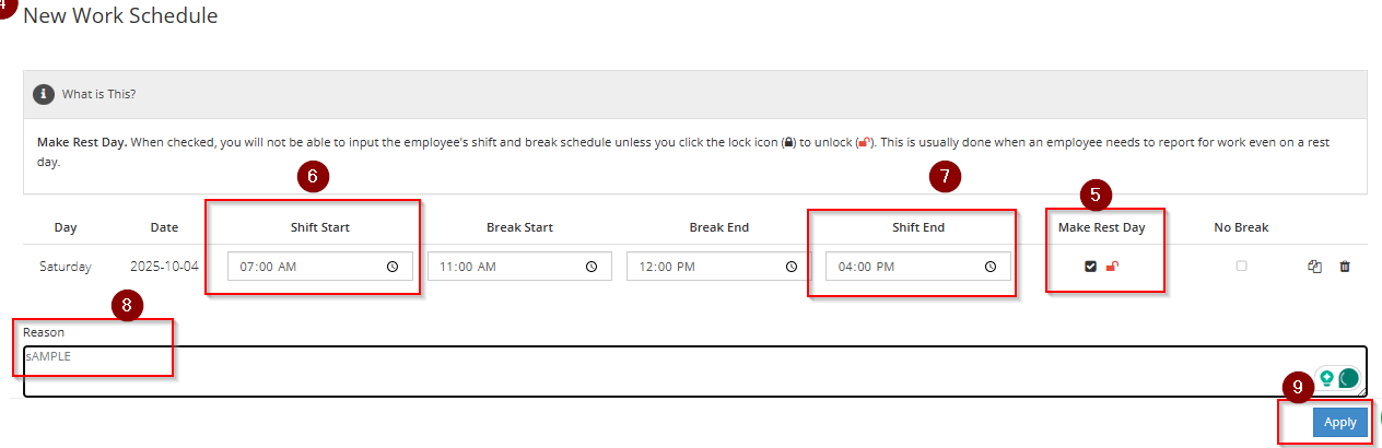 It will be under pending applications of your approver. Make sure the Rest Day (box icon) is ticked, and the Padlock is unlocked( to be able to encode a time). The hours rendered within the scheduled time will be compensated with a Rest Day Premium.
