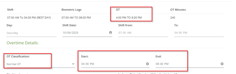 In this example, 4:00 PM to 8:00 PM will be applied as Rest Day OT.