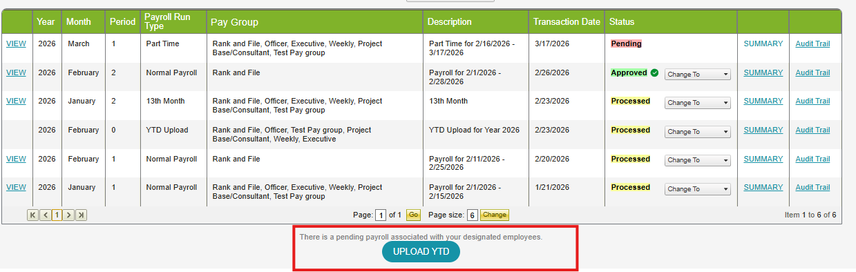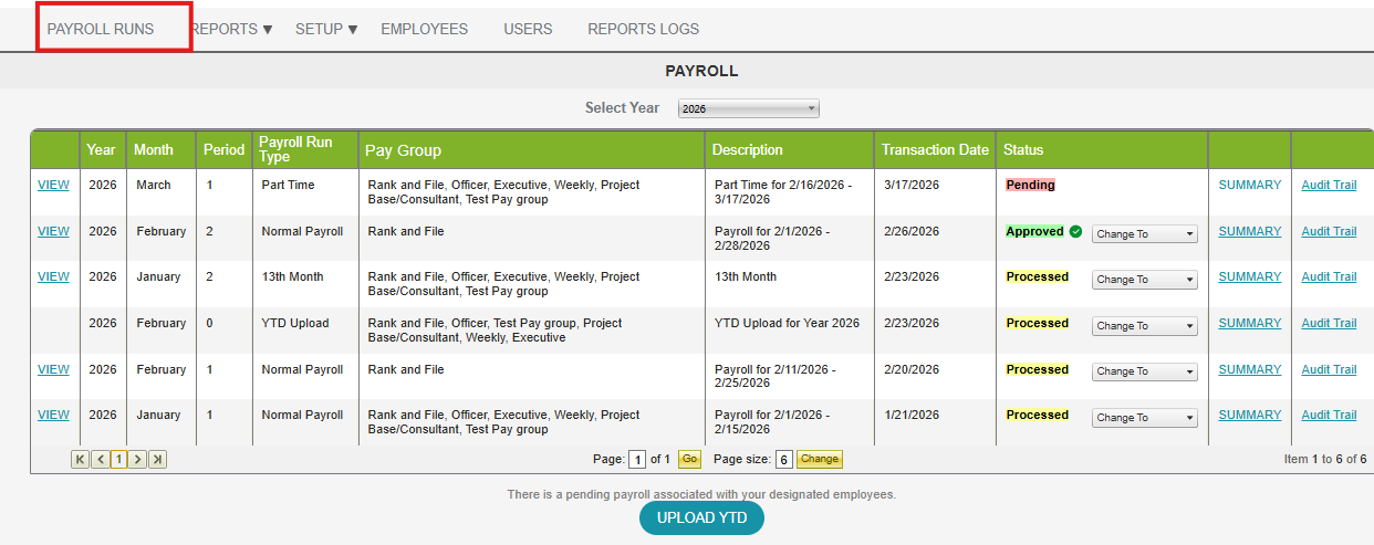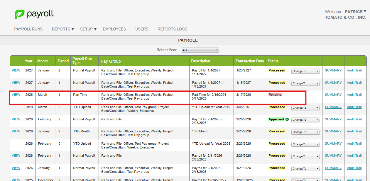 - In the screenshot above, the Pending is the March- Period 2 (Normal Payroll)