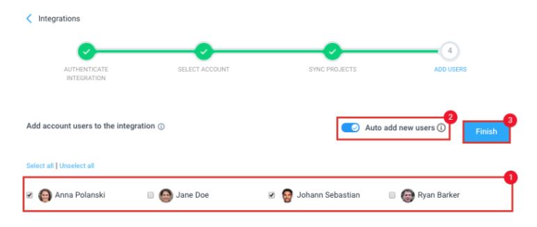 After linking projects, you can connect users to your integration. You can select/unselect all users, choose individual users, and/or automatically add new users to this integration in the future. Click Finish to complete the integration set-up.