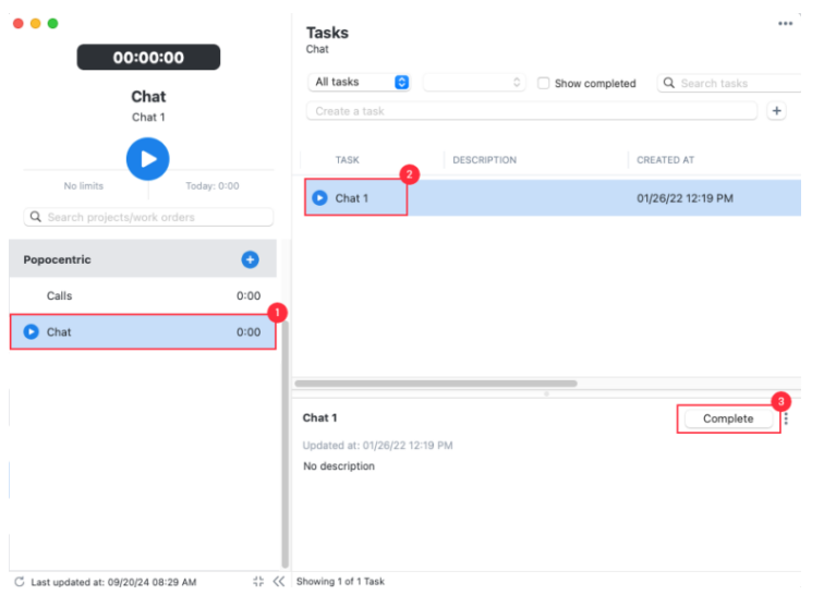 Click on the project name, then the Play button next to the task name to begin tracking time to the task. Press the complete button in order to mark the task as complete.